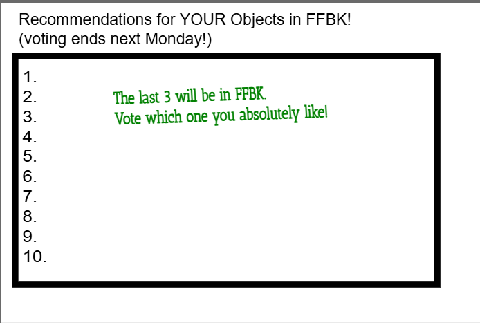 btw. I’m hosting a object recommendation contest!! there are ten slots for the objects that you guys recommend! voting ends on next Monday!