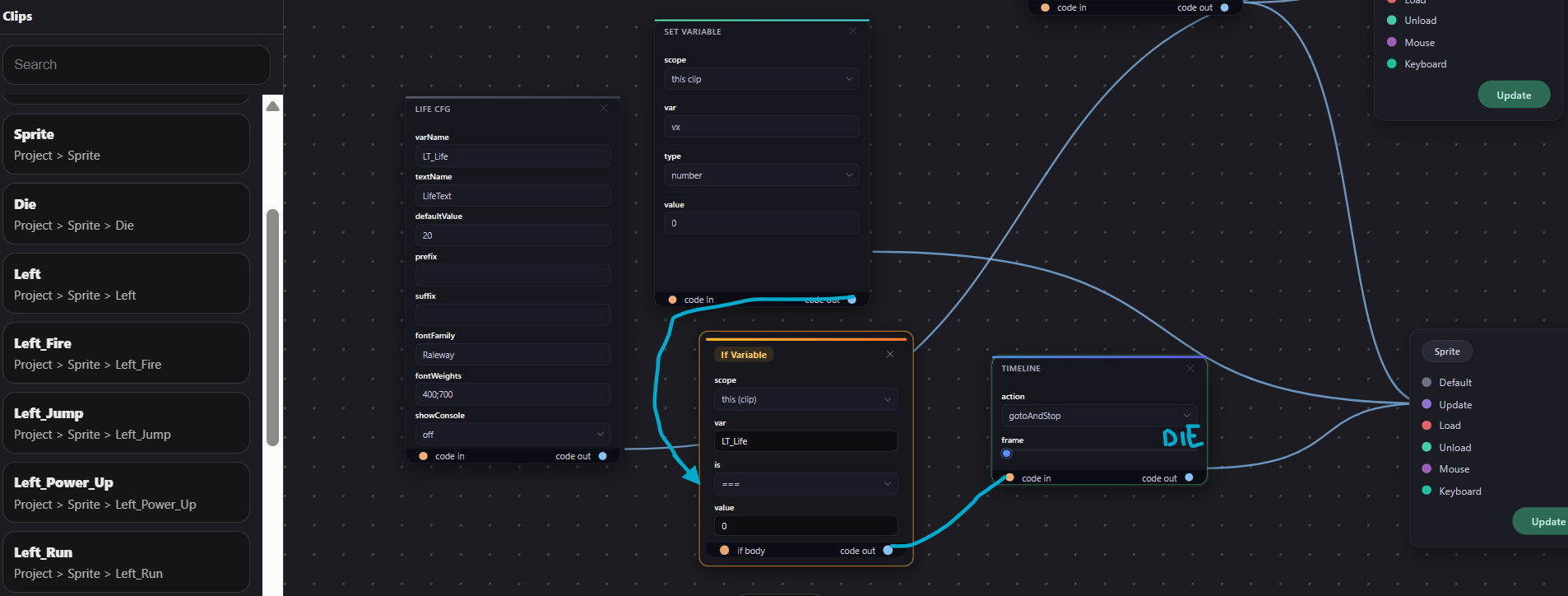 An event drops the LT_Life to (0) and that then triggers the game to end or the sprite to gotoAndStop(“DIE”)