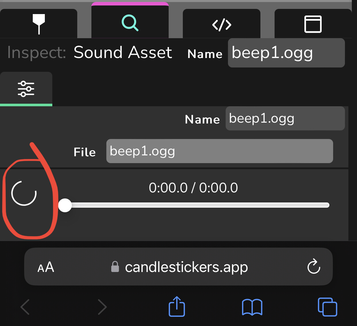 It’s common practice for users of both Wick Editor and Candlestick to playback an sound asset from the library in the inspector to check and see if it’s good for use. This works for any compatible browser in desktop, but in mobile it seems to not work at all. (Screenshot 1.)